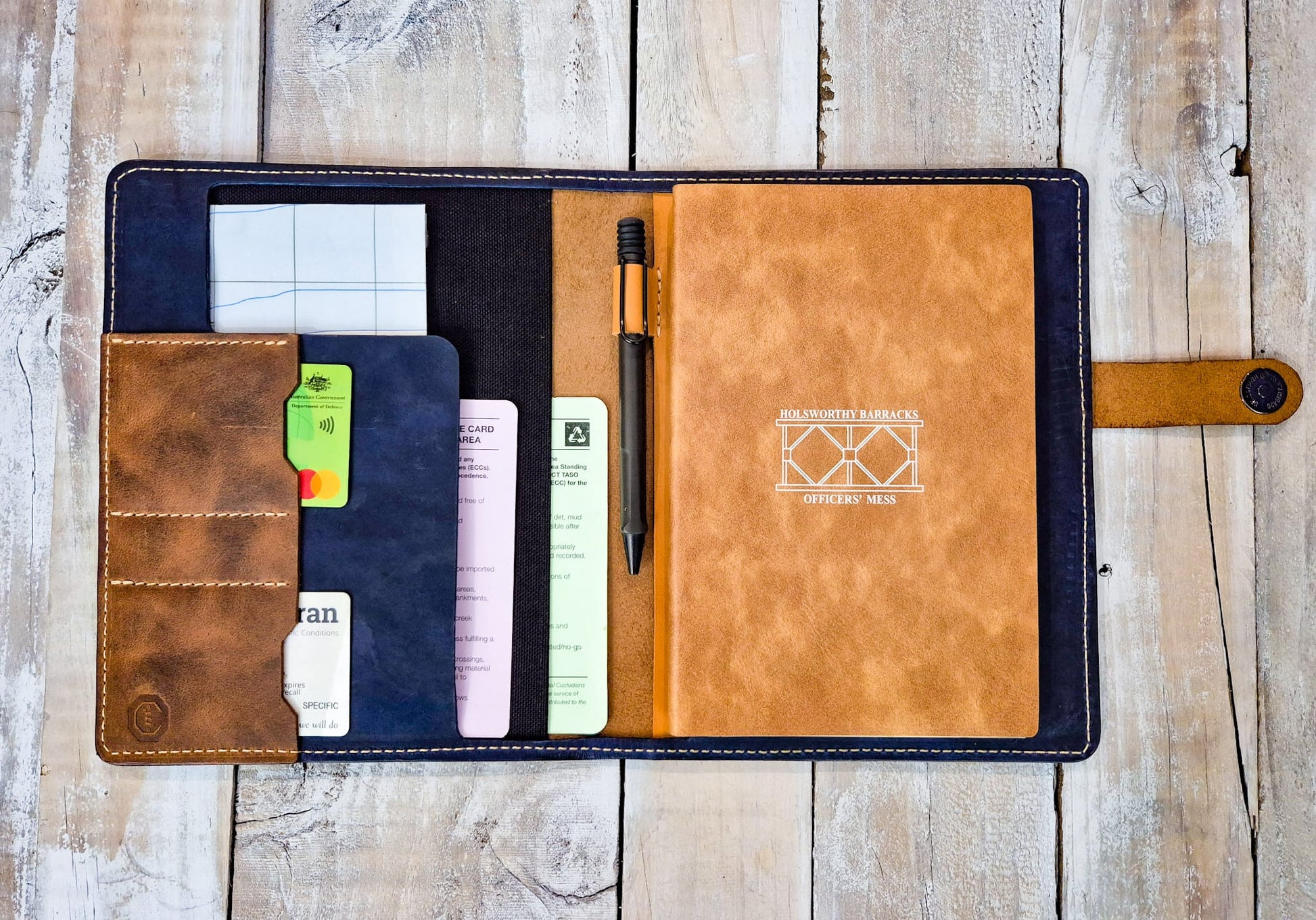 Protect your notes with this A5-sized Australian leather cover, built to handle real-world use without compromising on style. Designed with 2 card slots, a full document sleeve, a built-in pen holder, and a sleek magnetic clasp, it's the perfect companion for journaling, fieldwork, or professional use. Water-resistant and durable, the full-grain leather develops a distinctive patina over time, making it uniquely yours.